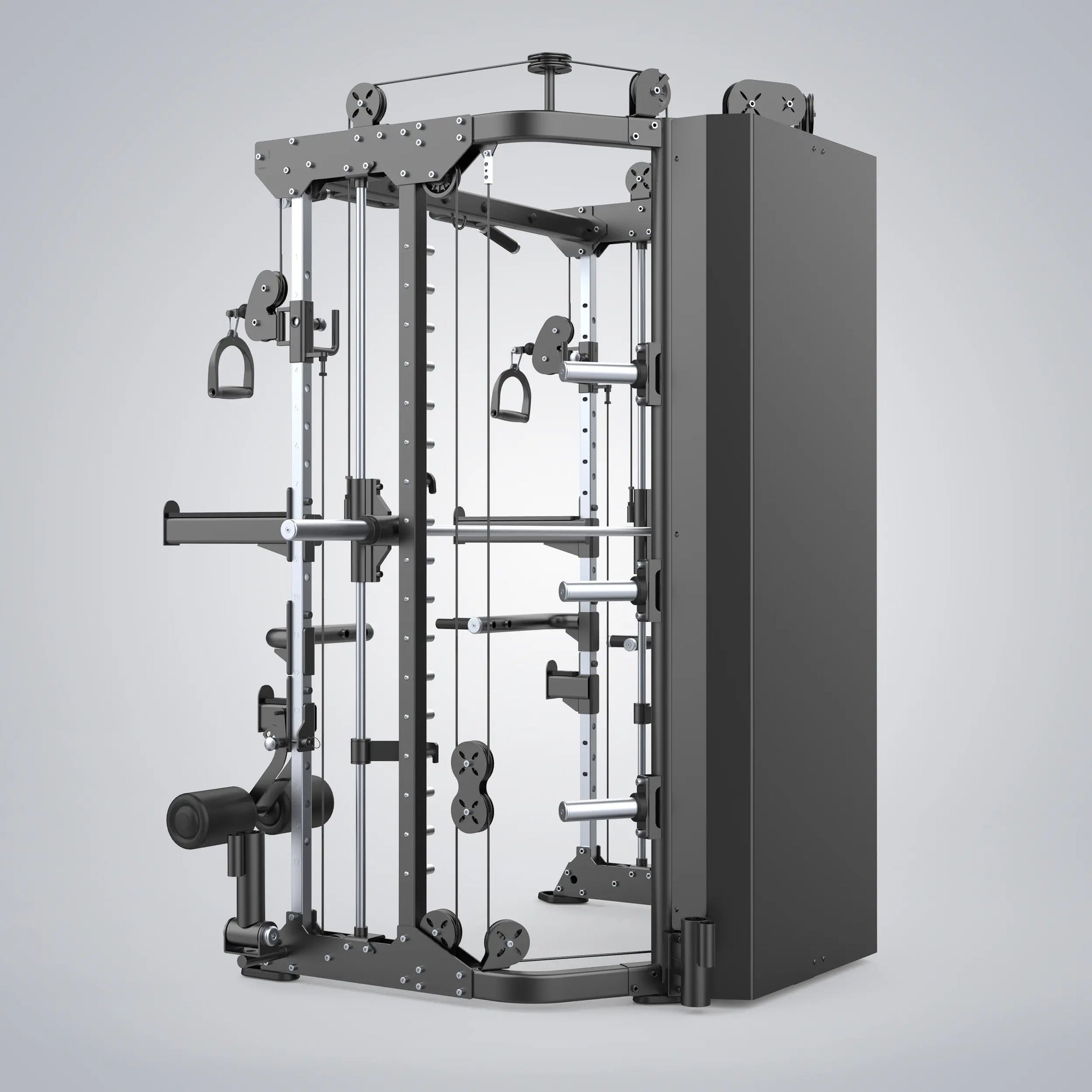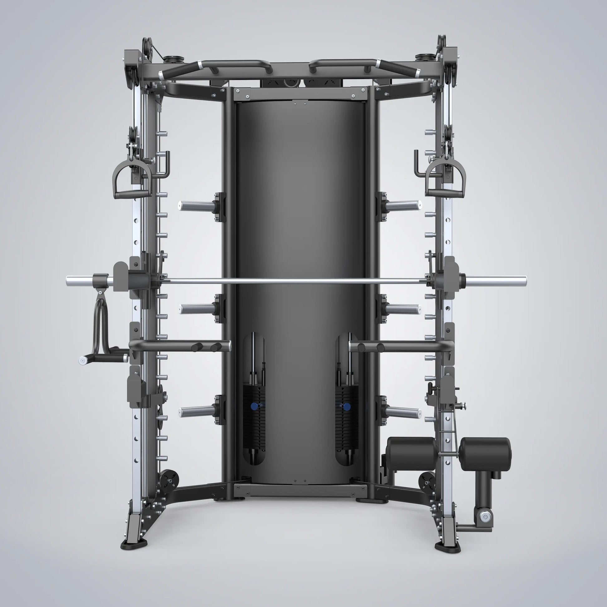 The DHZ Functional Smith Machine features the most popular training types in one. The best strength training solution for limited space. It has pull up/chin up bars, spotter arms, j hooks for squat and barbell rest, an outstanding cable system and probably 100 other features. The stable and reliable smith system provides fixed rails to help exercisers get lower while stabilizing training positions starting weight. Support single or multi-person training at the same time.